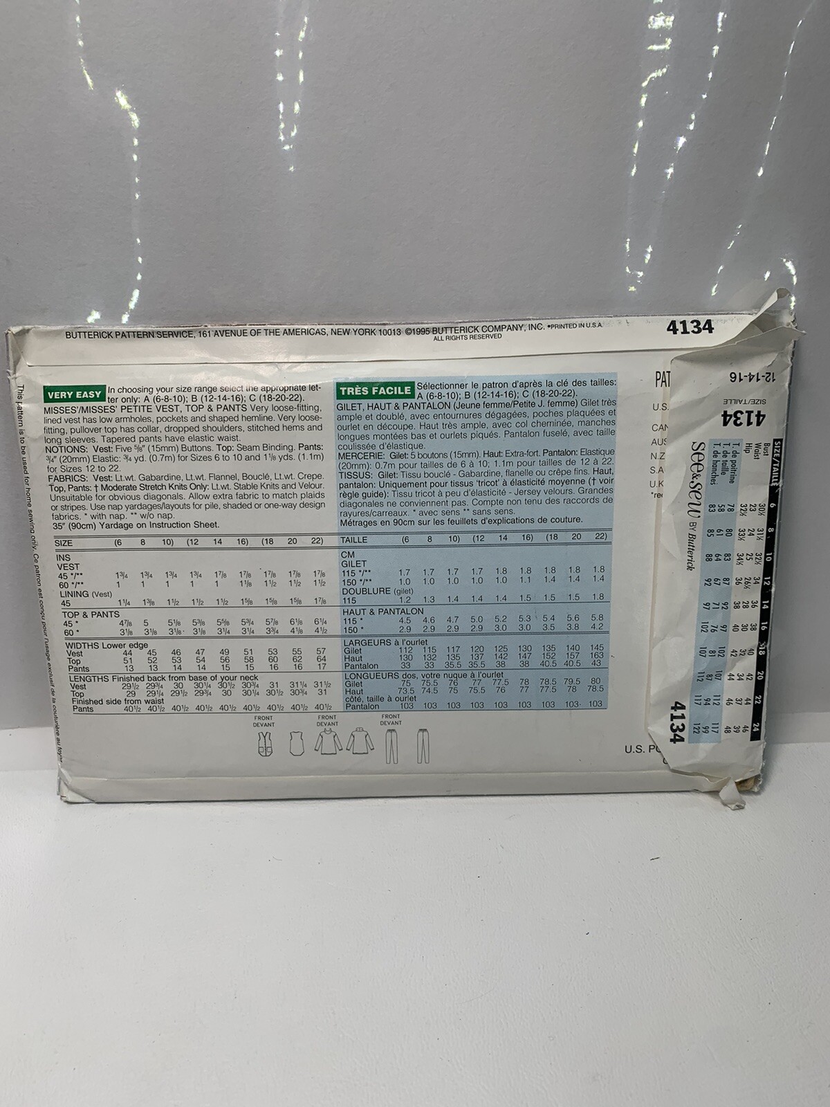 Butterick Pattern 4134 Ms Ez See Sew Vest Pullover Top Tapered Pants 12 16 Ebay